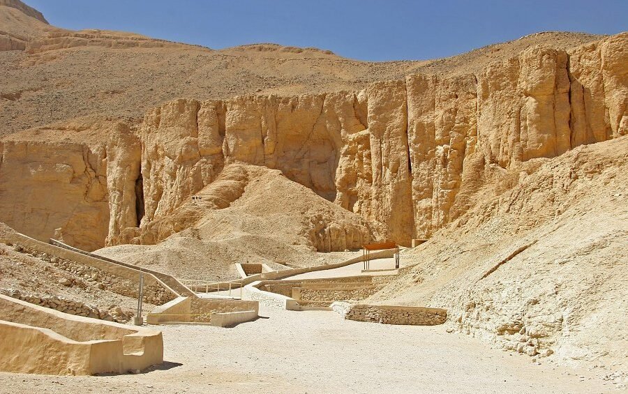 The Valley of the Queens appears to be a sun-drenched, rocky valley with simple stone gateways leading to the burial area, where tombs have been uncovered. The remains of the pharaohs’ wives were buried in ancient Egypt.